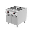 Aus Edelstahl mit Scotch Brite-Finish und versenkten Nähten, 20/10 starke geformte Platten mit herausnehmbaren Behältern und abgerundeten Ecken für optimale Reinigung. Erhältlich in Versionen mit offenem Fach oder mit Flügeltür. Vertikale 5 Kw- und 8 Kw-Brenner mit Einzel- und Doppelkrone.